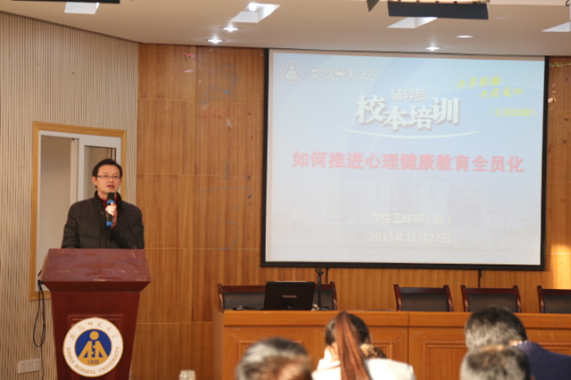 本网讯(学工部 杨一飞 沈艳红)为帮助全体专兼职辅导员做好学生心理健康教育工作,11月27日下午,学校举行“如何推进心理健康教育全员化”为主题的辅导员工作校本培训。全体专兼职辅导员参加了培训会,培训会由学工处副处长张玉新主持。