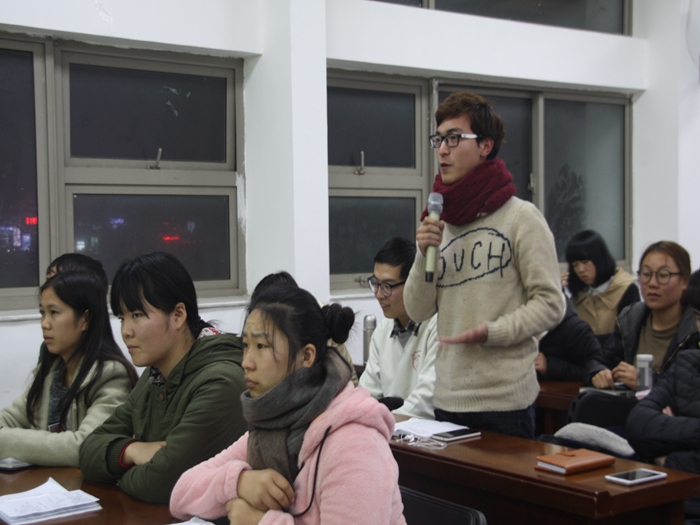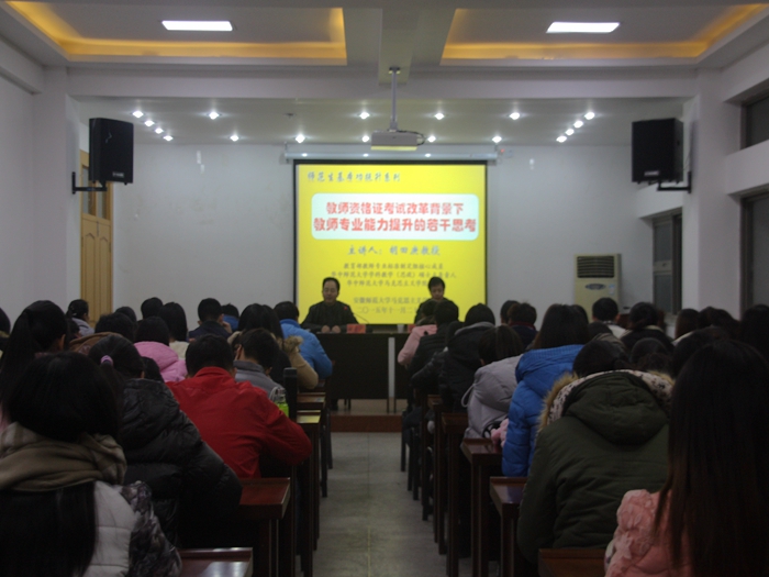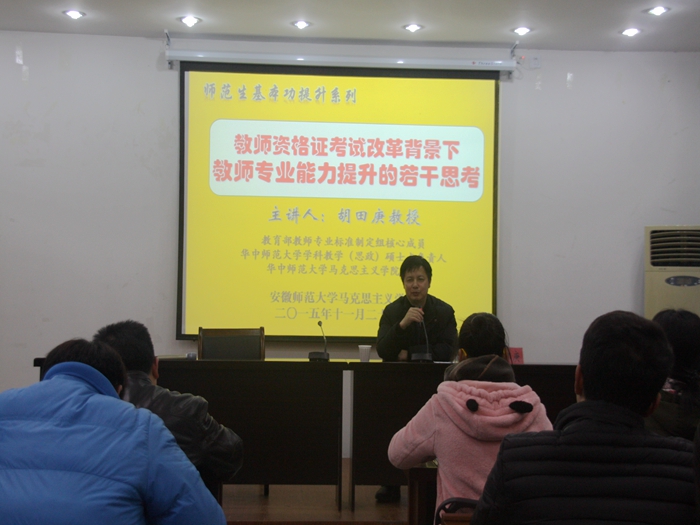 本网讯(文/范冉冉 摄/吴梦)为进一步加强同学们思想认知,提升师范生基本功,11月26日19时,教育部教师专业标准制定组核心成员、华中师范大学学科教学硕士点负责人、华中师范大学马克思主义学院教授胡田庚应邀于马克思主义学院行政楼五楼会议室为2014级思想政治教育专业学子讲授 “教师资格证改革背景下教师专业能力提升的若干思考”。本次讲座由学院副院长姚宏志主持。