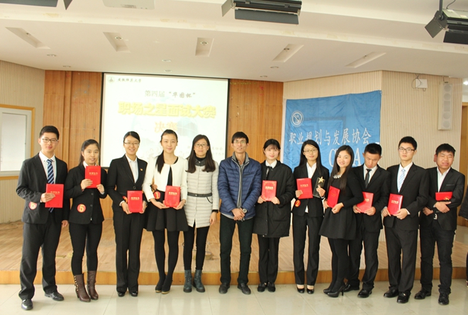 从初试的笔试、简历制作到复试的面试比拼再到最后的决赛,历时一个月,共有10位选手脱颖而出在决赛中展示自己的职场风采。决赛分为“职场我展示”和“职场我了解”两大环节。在第一环节中,评委通过参赛选手的自我介绍、VCR展示以及现场答辩三方面来进行考核打分。选手们制作的VCR内容丰富,全面的展示了自己的性格与经历;在面对面试官们犀利的问题时,选手们沉着冷静,对答如流。在这些尖锐的问题面前,选手们展现出了大学生应有的自信和随机应变能力。此外,评委老师对参赛选手的表现也做出了精准而深刻的点评并提出了中肯的意见。第一环节结束后,经过评委们的讨论,4位优秀者进入了第二轮的比赛,而第二环节的模拟题更是将选手带入到现实的职场环境中,让他们对可能遇到的职场难题提前做准备,并且认真考虑如何能够完美解决职场瓶颈。选手们根据自己的知识与经验,纷纷给出了自己的建议和对策,赢得了现场观众的阵阵掌声。最终赵娇娇、吴娜夺得一等奖,潘心儒、叶凯获得二等奖,吴丹、徐晓月和刘园园获得三等奖,马国庆、徐俊和甘学鹏获得优秀奖,随后评委嘉宾为获奖者颁奖,历时一个月的职场之星面试大赛圆满落幕。