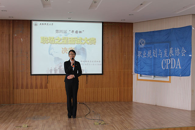 本网讯(经管学院 吕洋 赵俊)2015年11月29日,由经管学院职业规划与发展协会与华图教育联合举办的第四届“华图杯”职场之星面试大赛决赛在大学生活动中心三楼就业指导报告厅举行。经管学院党委副书记李海燕、工商管理系教授马骥、院团委副书记汪华伟以及华图教育、红牛集团、正伦律师事务所、汉庭酒店、如家酒店的负责人出席了活动并担任评委。
