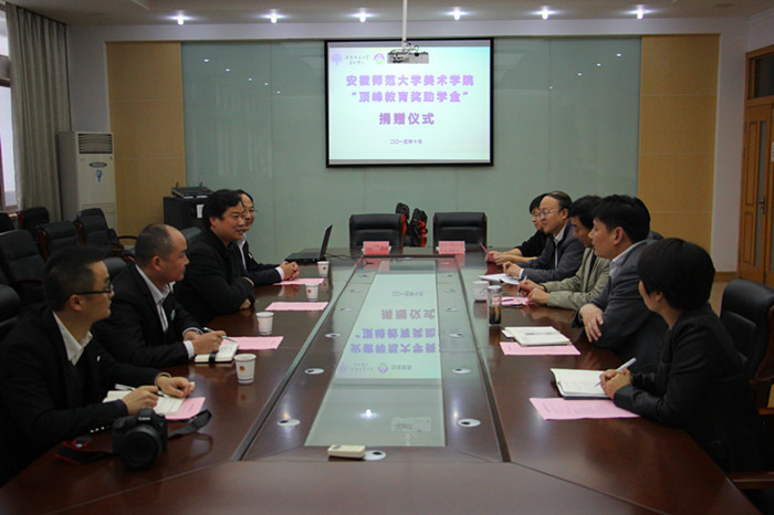 本网讯(美术学院 李高举)10月30日上午,美术学院顶峰教育奖助学金捐赠暨实习基地授牌仪式在学院会议室举行。安徽顶峰教育集团董事长夏云兴、副董事长龙云、办公室主任蔡小峰,美术学院党委书记王刚、院长高飞,副院长刘曼玉、詹学军及各年级辅导员出席签约和授牌仪式。仪式由美术学院党委副书记张韬主持。