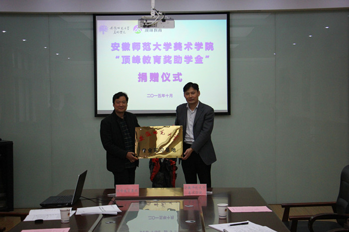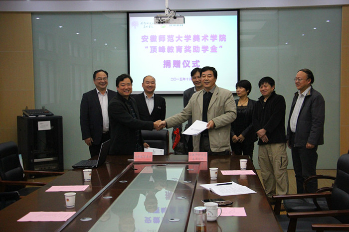 顶峰教育奖助学金是美术学院首个企业资助的本科生奖助学金,捐赠单位安徽顶峰教育集团是专门从事教育及文化创意产业方向的投资型企业。根据奖助学金协议约定,安徽顶峰教育集团共出资10万元,分3年对美术学院的优秀本科生进行奖励,对自强不息的贫困本科生予以资助。