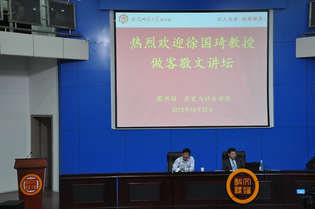 教授满含深情地表达了阔别母校31年后再次回到安师大的亲切之感。他指出,在这30多年里,师大在发展,中国在发展,世界也在发展,新形势下重新审视中美关系发展之路显得尤为重要。由于冷战思维在学术研究中的影响,中外学术界在研究中美关系史时,一直强调两国文化的差异,历史背景的不同,侧重中美之间的冲突、对抗和分歧。诚然,这些差别和分歧是历史事实,但是中国人与美国人之间有着共同的历史经历和旅程,正如哈佛大学尼尔·弗格森(Niall Ferguson)创造的新地缘政治名词“Chimerica”提醒世人中美两国是密不可分的新型大国关系;再如中美学者联合发表论文数量激增,两国学者间的合作更是蒸蒸日上等,均说明中美两国关系发展已经达到两国必须经历“共享的旅程”或面临“共同的现实”之新境界了。诚如基辛格在《论中国》中所言:中美两国彼此太大,不会被另一方所控制;彼此太有个性,不会互相迁就;彼此太需要对方,无法分道扬镳,两者间是一种相互依存的关系。所以,应该眼光向下,从下往上看历史,看到中美两国人民间的友好交往以及共同创造的许多美好的东西。接着,他重点介绍了在中美文化交流史上的一位先驱人物——戈鲲化,作为第一个执掌美国大学中文教席的中国人,中美两国人民的友好使者,他的经历是中美两国人民“共有”历史中重要的一章。徐国琦高度肯定了戈鲲化在中美两国“共有”历史中所扮演的重要角色,认为今天中国设在世界各地的孔子学院应该向戈鲲化学习,以戈鲲化为师,为中美文化交流做出新的更大的贡献。最后,徐国琦认为“共有”的历史作为一个新的研究范式呼之欲出,中美两国关系史的研究要求同存异,彻底打破历史研究中“民族—国家”的约束,强调非政治、非“民族—国家”因素的作用和影响,同时立足“共有”历史的分享与探讨,自下而上,关注民间,同舟共济,合力创造人类文明的美丽家园。