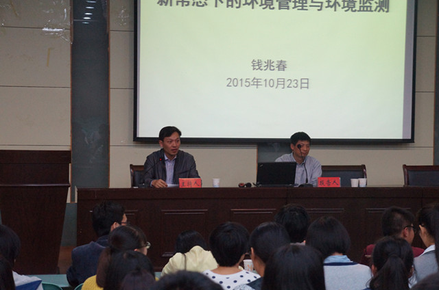 本网讯(环工学院 鲁春玲)10月23日,芜湖市环境监测中心站副站长钱兆春应邀来到环境科学与工程学院,为2015级环境专业学生作了题为“新常态下的环境管理与环境监测”的专题讲座,环工学院教学副院长杨如意,环境专业教师代表,以及2015级环境专业全体学生共同聆听了此次讲座,讲座由杨如意主持。
