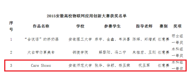 本网讯(数计学院 赵大东)近日,安徽省教育厅对第二届安徽高校物联网应用创新大赛获奖名单进行了公示。其中,由数计学院祝玉军老师指导的“care shoes”获得创意组一等奖,罗晓萍老师指导的“小腕”手环--景区游客管理系统、徐德勤老师指导的“基于传感器技术的智能环保自行车”、方群和祝玉军老师指导的“云枢—物联网第三方平台”获得二等奖,陈付龙老师指导的“环测移动小助手”与赵大东老师指导的“智能垃圾处理系统”获得三等奖。