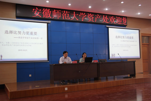 本网讯(环工学院 鲁春玲)10月21日,安徽三只松鼠电子商务有限公司食品研究院秘书长、食品科技及产业化研究所所长朱慧敏应邀来到环境科学与工程学院,为2015级食品专业学生作了题为“选择比努力更重要”的专题讲座,环工学院教学副院长杨如意,食品专业教师代表,以及2015级食品专业全体学生共同聆听了此次讲座,讲座由杨如意主持。