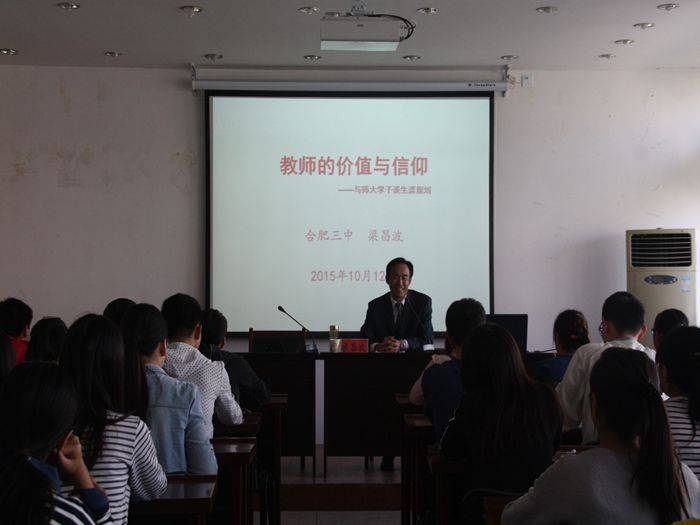本网讯(文/范冉冉 摄/吴梦)为进一步提升师范生基本功,夯实学生的从教技能,10月12日下午,1996届校友合肥市第三中学副校长、中学政治高级教师、安徽省教师资格认证专家组成员梁昌波应马克思主义学院邀请于学院五楼会议室为2014级思想政治教育专业学生讲授“中学政治教师的价值与信仰”。讲座由学院党委副书记梁齐军主持。