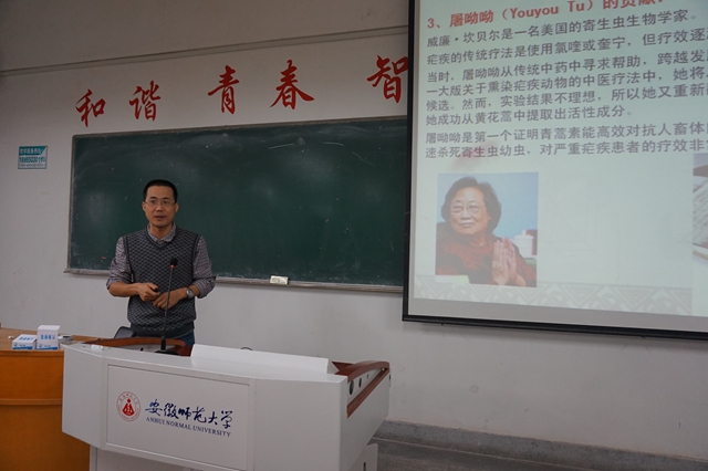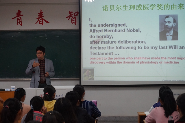 阚显照教授在报告中详细生动地介绍了诺贝尔生理或医学奖以及诺贝尔奖与药物的发现发明,通过实例向学生们介绍多位诺贝尔生理学或医学奖获得者的成就以及这些成就给人类生命健康带来的帮助,他希望15级应生学子勤学慎思,在生物制药领域开创一片蓝天。随后,陈冬生副教授为同学们解读了2015年生理学或医学奖,他详细介绍了青蒿素的发现历程,强调了科研团队集体攻关的重要性,突出介绍了屠呦呦教授提出使用乙醚提取青蒿素等在整个发现过程中所起的关键性作用。