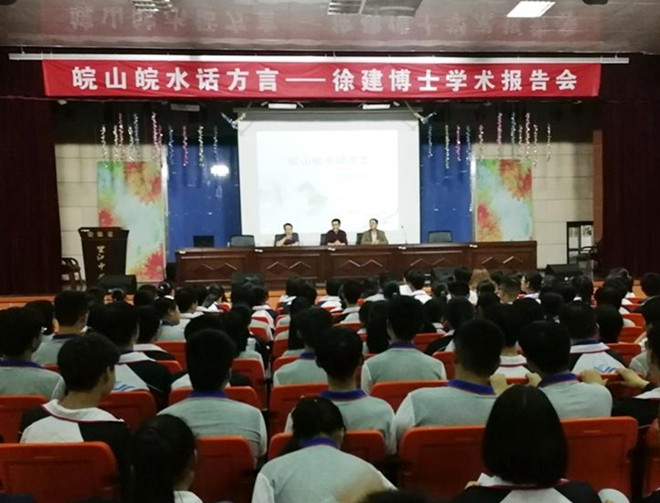 本网讯(文学院)2019年5月15日晚,我院徐建老师应邀到望江中学为该校高二年级全体师生做了以《皖山皖水话方言》为主题的学术报告。