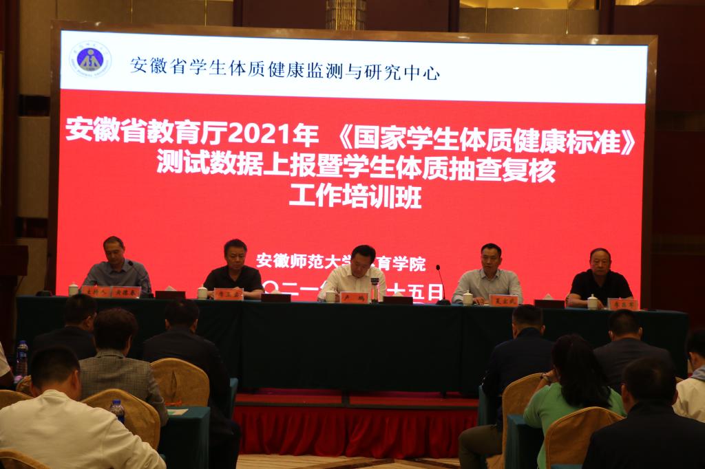 本网讯(体育学院 刘应、张如)近日,安徽省教育厅2021年《国家学生体质健康标准》测试数据上报暨学生体质抽查复核工作培训班在我校举行。省教育厅体卫艺处处长卢鹏、干部夏宏武、省学校体育教学指导委员会秘书长李昌军,省学生体质健康监测与研究中心常务副主任、体育学院院长席玉宝,省学生体质健康监测与研究中心副主任、体育学院副院长高升,全省16个地市,2个直辖县以及100多所高校的分管体育负责人出席本次培训班。会议由体育学院党委副书记黄德春主持。