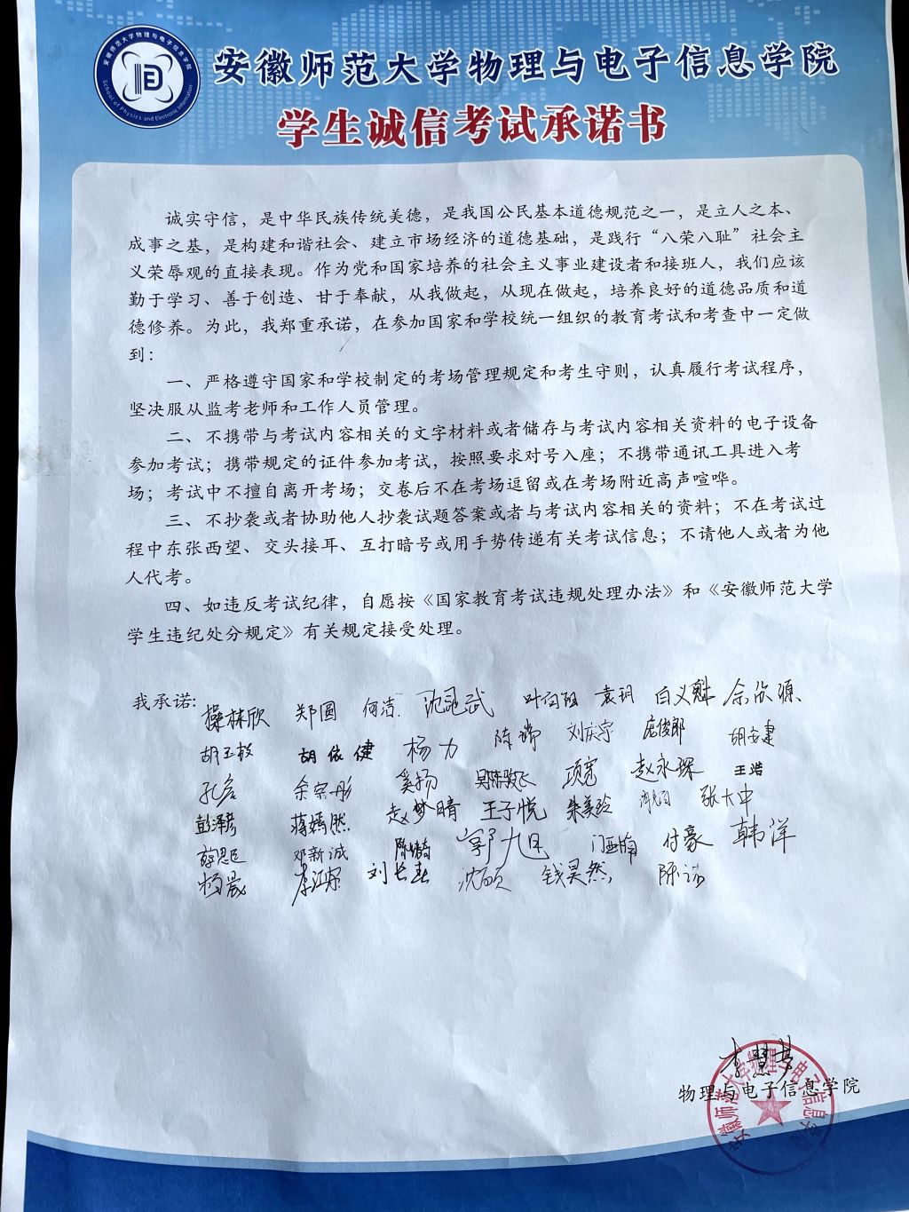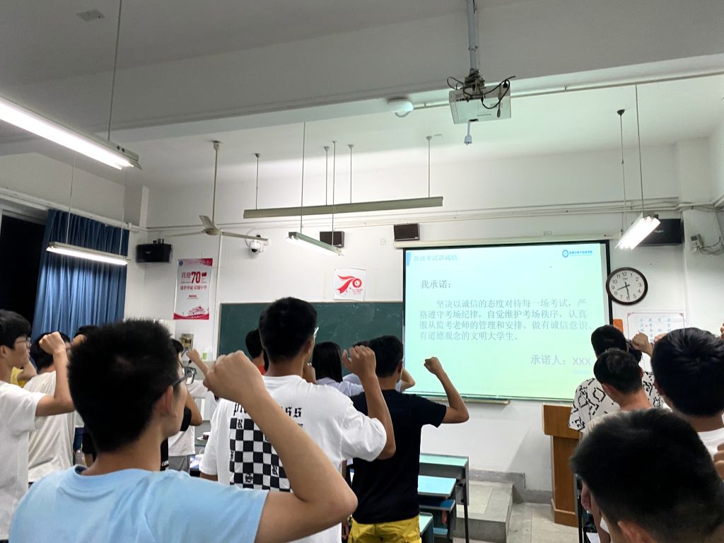 学院各班级在传达学校、学院诚信考试要求的基础上,组织所有学生认真阅读了诚信考试承诺书,对个人、班级、学院、学校作出承诺,践行诚信考试承诺,自觉遵守考场规定,杜绝违规违纪行为的发生。