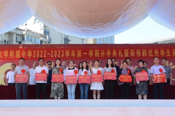 9月5日上午,附属中学在学校大操场举行2022-2023学年第一学期开学典礼暨郑伟鹤优秀学生奖学金颁奖仪式,向2022届优秀毕业生颁发了郑伟鹤奖学金,并奖励了2022年信息、生物学科竞赛中荣获全国金、银、铜牌的优秀选手。全体师生参加典礼,典礼由副校长吴树烈主持。