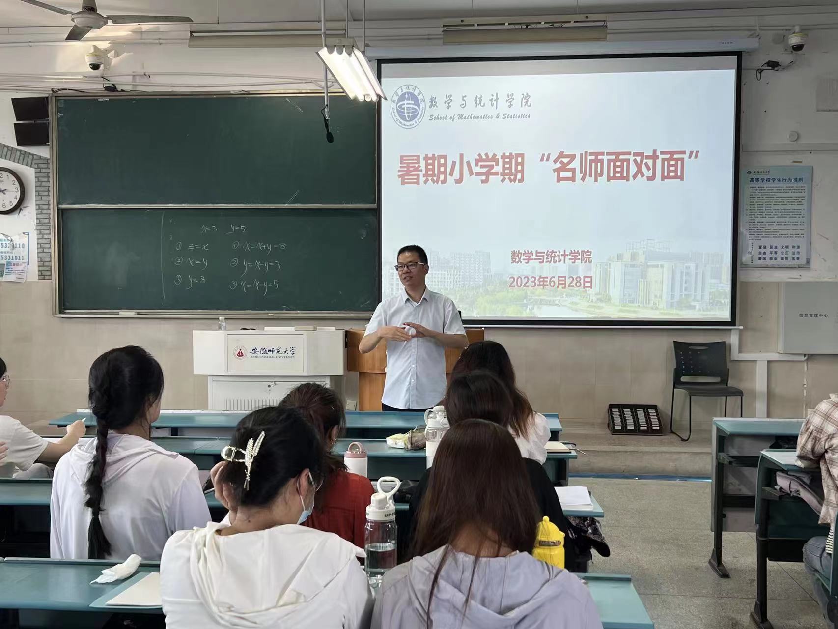 自暑期小学期开始以来,数统学院同步开展了“名师面对面”系列座谈活动。目前该活动已开展了两期,先后邀请了安徽师范大学附属中学的数学骨干教师叶国平、王立昌、曹多保、谢国忠,马鞍山二中高级教师卢建军,天长中学高级教师王威,铜陵一中省特级教师陈良骥等名师及学院学科教学论方向教授。参与暑期小学期的全体学生参加了这两期座谈会。各位名师通过职业发展、教育情怀、成长之路等主题与同学们进行了面对面交流与讨论。