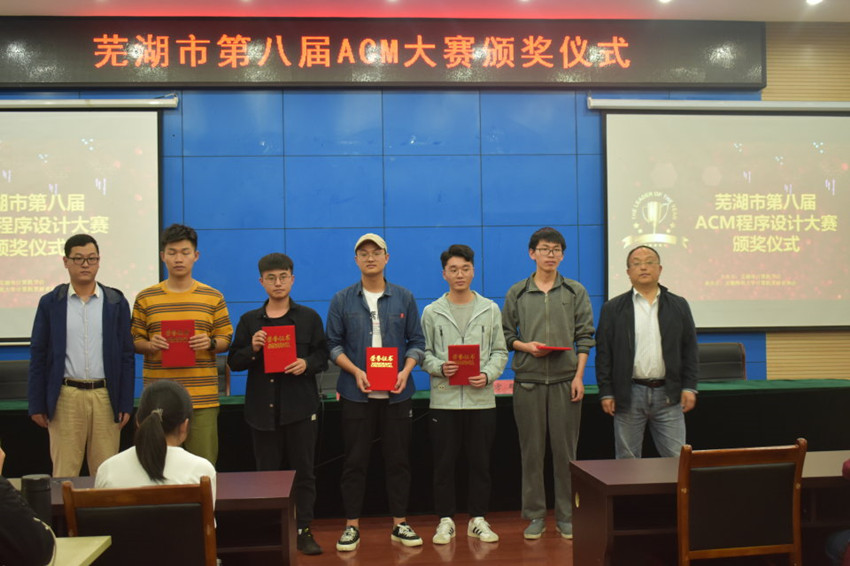 颁奖典礼于下午2点在圆形报告厅进行,计信学院团委书记王程主持典礼,芜湖市计算机学会秘书长方群老师为获奖选手颁发证书。颁奖典礼上方群老师简要讲解了比赛试题的解题思路并代表芜湖市计算机学会向参赛选手表示感谢,向获奖选手表示诚挚的祝贺。最后,参赛选手与老师们在图书馆前合影留念,为此次大赛画上圆满的句号。