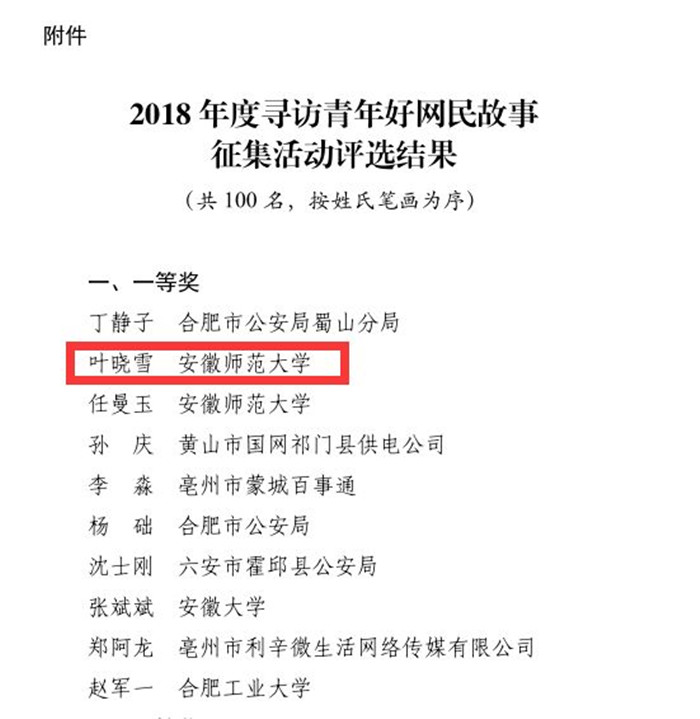 本网讯(新闻与传播学院) 2月27日,共青团安徽省委、中共安徽省委网信办及安徽省学生联合会共同发布了《关于公布2018年度寻访青年好网民故事征集活动评选结果的通知》,其中,新传学院2017级网新专业叶晓雪、2016级新闻专业曹寅飞和2017级网新专业赵柳明同学分别获得一、二、三等奖。