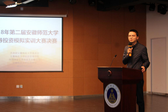 本网讯(经管学院 吕洋 经济学会)2019年3月23日,由共青团安徽师范大学委员会、安徽师范大学经济管理学院主办,经济管理学院大学生经济学会承办,深圳国泰安股份有限公司提供技术支持的第二届证券投资模拟实训大赛决赛在大学生活动中心二楼团委多功能厅举行。国泰安技术教育有限公司安徽营销公司副总经理张明、高级讲师张传新,校团委副书记汪凯、经管学院院长张廷龙、院党委副书记李海燕,投资系主任胡小文、钱梅瑞、徐尚友、胡娟、李臻、院团委书记吕洋等担任评委。