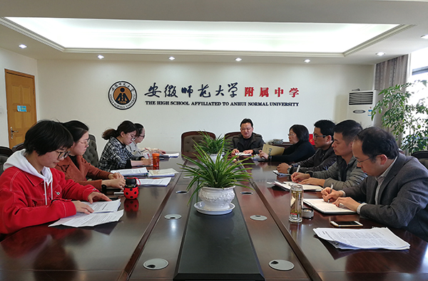 本网讯(附中 文/图 贾湲湲)3月19日下午,安徽师范大学附属中学省级课题“基于核心素养的诊断性测评在高中英语阅读教学中的设计与应用研究”和“基于核心素养的翻转课堂在高中英语阅读教学中的设计与应用研究”课题工作推进会在竟成楼四楼会议室召开,课题组负责人王万元主持会议。