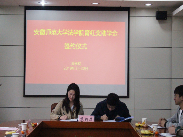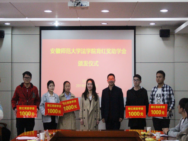 本网讯( 法学院)3月20日下午,法学院在校行政楼第一会议室举行2019年育红奖助学金颁发仪式。育红奖助学金捐赠人杨育红女士、法学院执行院长严宏、育红奖助学金联系人陆在春老师、院资助负责人王琳及2019年育红奖助学金获奖者参加仪式。仪式由院党委副书记王少仁主持。