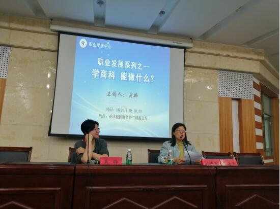 本网讯(经管学院职业发展中心)3月20日18:00,ACCA和AICPA双证持有者吴晔女士受邀做客经济管理学院,并在花津校区财务处二楼报告厅为学院二、三年级同学就“学商科,能做些什么”这一问题做分享交流。院团委书记吕洋老师、职业发展中心主任安广虎参加讲座,讲座由经济管理学院党委副书记李海燕主持。