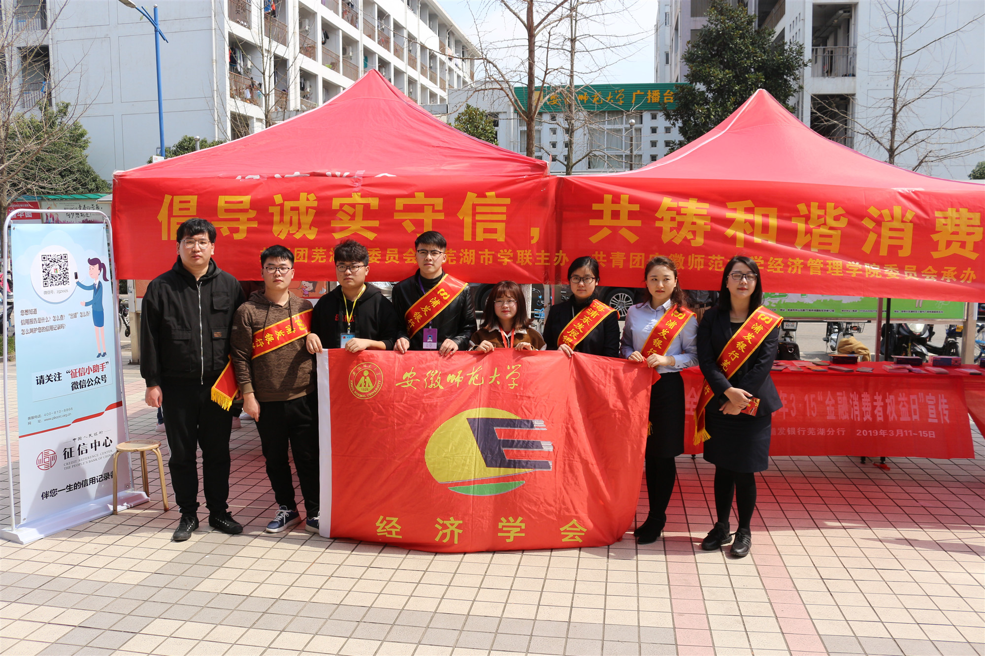 3月15日,经济管理学院团委联合浦发银行芜湖市分行举行“倡导诚实守信·共铸和谐消费”国际消费者权益日主题活动。校团委副书记汪凯、校团委蔡志鹏、经管学院党委副书记李海燕、经管学院团委书记吕洋等参加了活动。