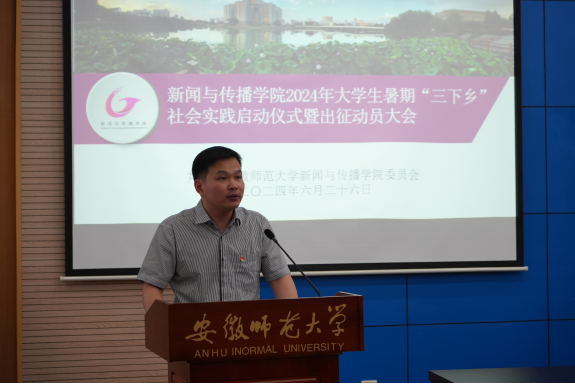 6月26日下午,新闻与传播学院2024年大学生暑期“三下乡”社会实践启动仪式暨出征动员大会在花津校区第三会议厅举行。校党委副书记胡靖,思政指导教师张鑫、胡荣涛,学院党政领导班子、指导教师、辅导员、44支社会实践团队代表等300余人参加会议。会议由学院党委副书记吴青山主持。
