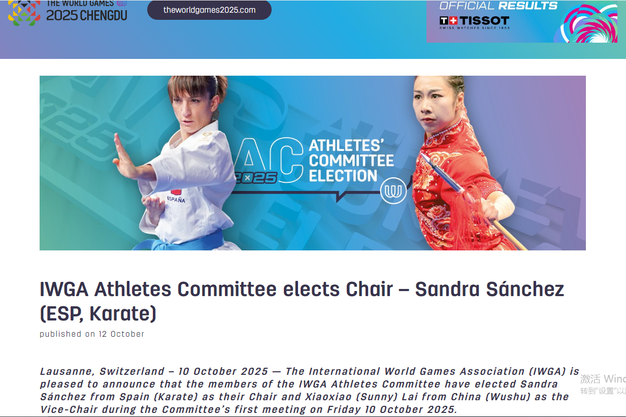 10月12日,世界运动会官方网站发布信息,中国武术名将、国际武联运动员委员会主任、安徽师范大学体育学院青年教师赖晓晓(Sunny Lai)当选国际世界运动会协会(IWGA)运动员委员会副主席,任期自2025年至2029年。