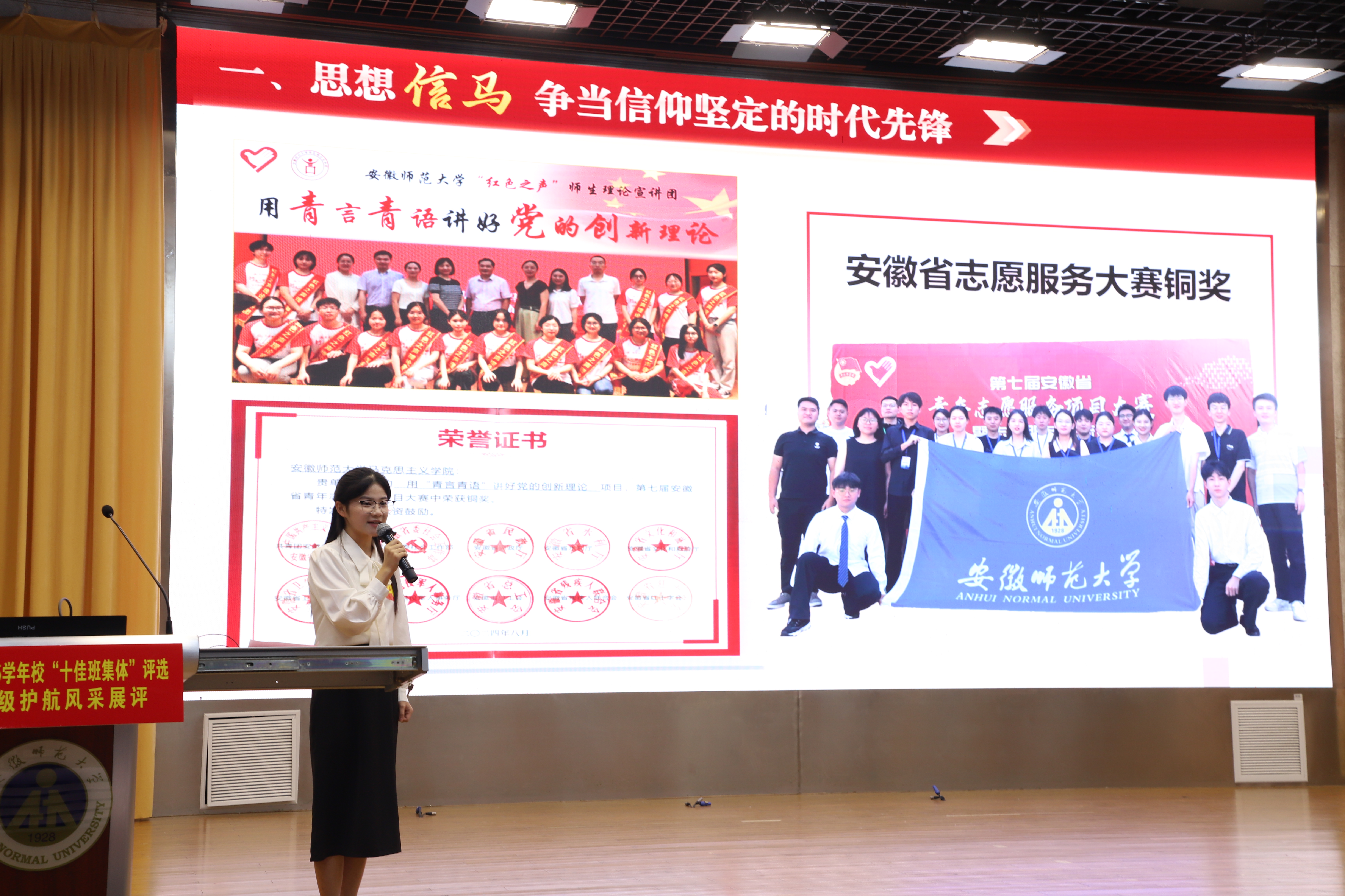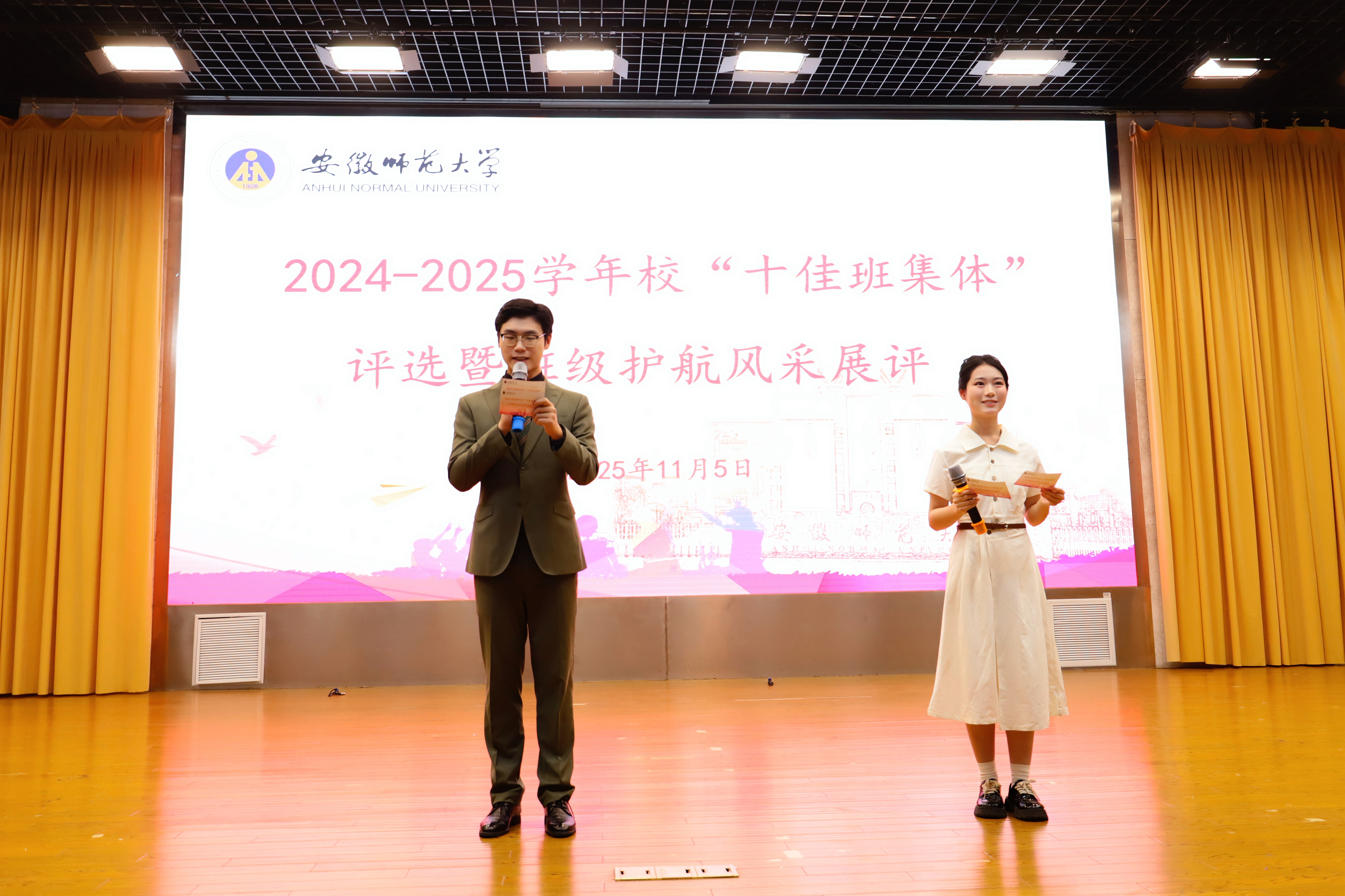 18个参评班级按照抽签顺序结合PPT和音视频,通过现场创作、专业展演、作品展示、情景模拟、科学实验、艺术表演等方式,将班级护航故事娓娓道来,从护思想、护学习、护生活、护情感、护身心“五护”等方面,汇报班级护航的特色做法和取得的成效。18个班级的汇报,既是一次班集体护航成效的交流展示,更是一堂高质量的青春思政课,为新学年各班级“十佳班集体”创建提供了可复制的经验,为学生成长成才指明了方向。经过激烈角逐,综合学院评选推荐、学校日常考核、师生代表互评等,思想政治教育(师范)专业2022级4班等入选2024-2025学年校“十佳班集体”,数学与应用数学(师范)专业2022级2班等班级入选2024-2025学年校“十佳班集体”提名奖。