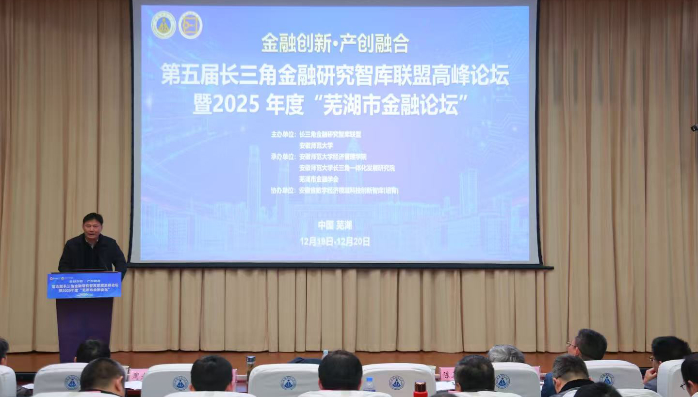 12月20日,第五届长三角金融研究智库联盟高峰论坛暨2025年芜湖市金融论坛在我校举办,我校经济管理学院、长三角一体化发展研究院和芜湖市金融学会共同承办。校党委常委、副校长王刚,长三角金融研究智库联盟秘书长、浙江大学朱燕建,中国银行研究院院长陈卫东,徽商银行芜湖分行党委书记、行长吴旭东,来自浙江大学、复旦大学、华东政法大学、华东师范大学、上海财经大学、安徽大学等高校50多位专家学者,《国际金融研究》《华东经济管理》《统计与信息论坛》等10余位期刊编委会负责人,芜湖市37家银行和金融机构负责人等参加论坛。校发展规划部部长张廷龙主持相关学术活动,经管学院院长马长伟、院党委副书记(主持党委工作)孙良林分别主持论坛开幕式和闭幕式。